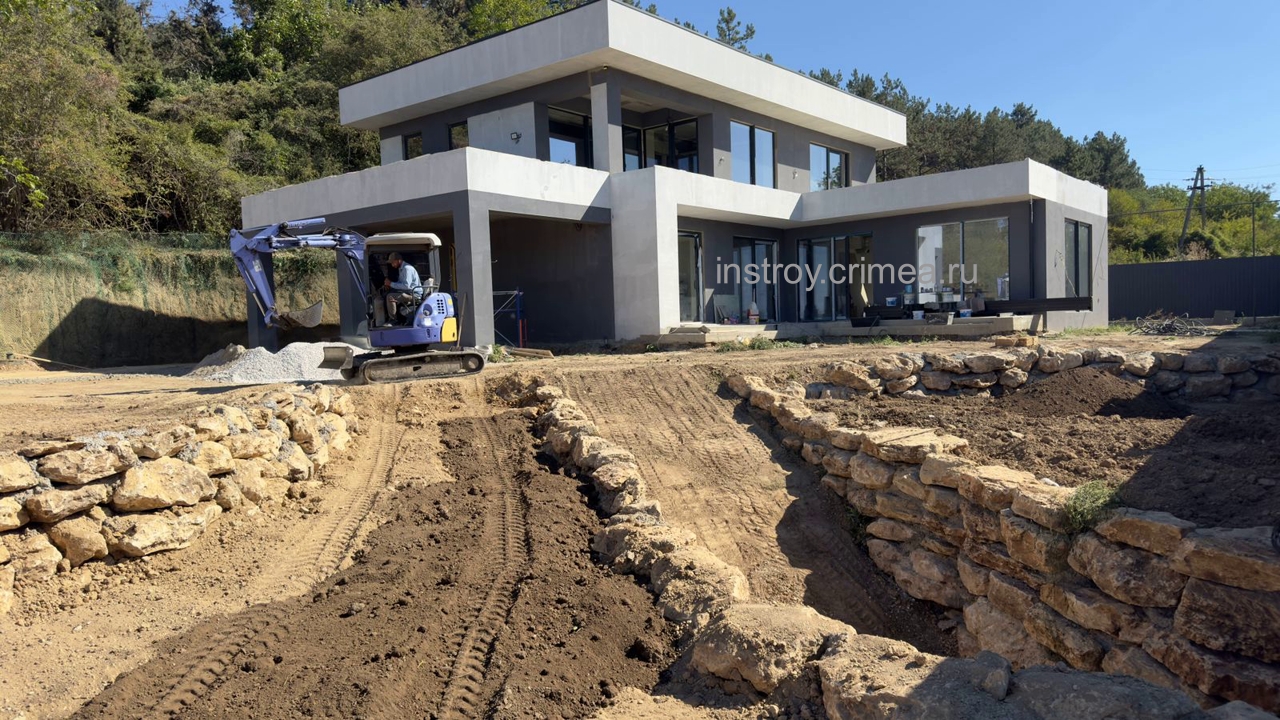 Проектная группа Симферополя ИНстрой представляет проект двухэтажного жилого дома, в современном стиле хай-тек с плоской крышей, 18 на 16 м., 242 м2 для строительства в Симферопольском р-не, с. Лозовое, ул. Подгорная. Каркасно-каменный монолитный каркас. Несущие наружные стены из известняка-ракушечника. Перегородки - газобетонные блоки, монолитные перекрытия, монолитные ленточные фундаменты. Кровля - плоская, ПВХ мембрана. Рассчитан на сейсмичность 8 баллов.